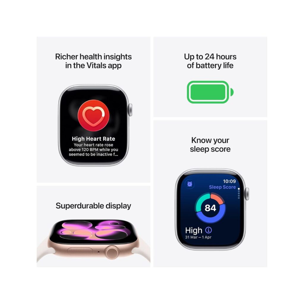 Whether you’re answering calls, responding to notifications, or streaming music on the go, the Series 11 delivers effortless connectivity powered by Apple’s latest operating system. Its crisp, vibrant Retina display ensures every glance is clear and easy to read, even in direct sunlight.