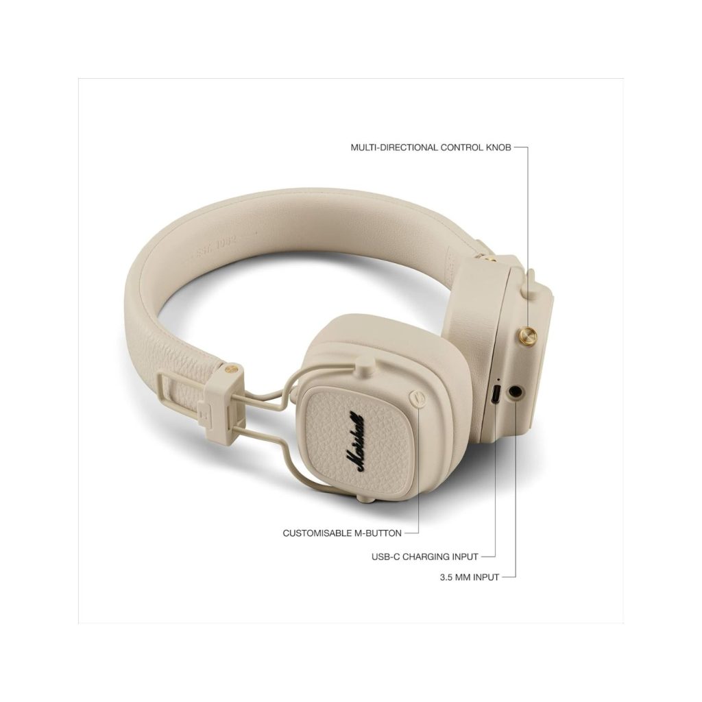 The Marshall Major V Bluetooth Headphones — Cream redefine the way you experience music. Engineered for audiophiles and casual listeners alike, these headphones deliver exceptional sound quality with a mix of deep bass, crisp highs, and balanced mids. Whether you’re diving into your favorite playlist or catching every detail in a podcast, the Major V ensures an immersive audio performance. Embrace every note with clarity and precision, thanks to cutting-edge sound technology.