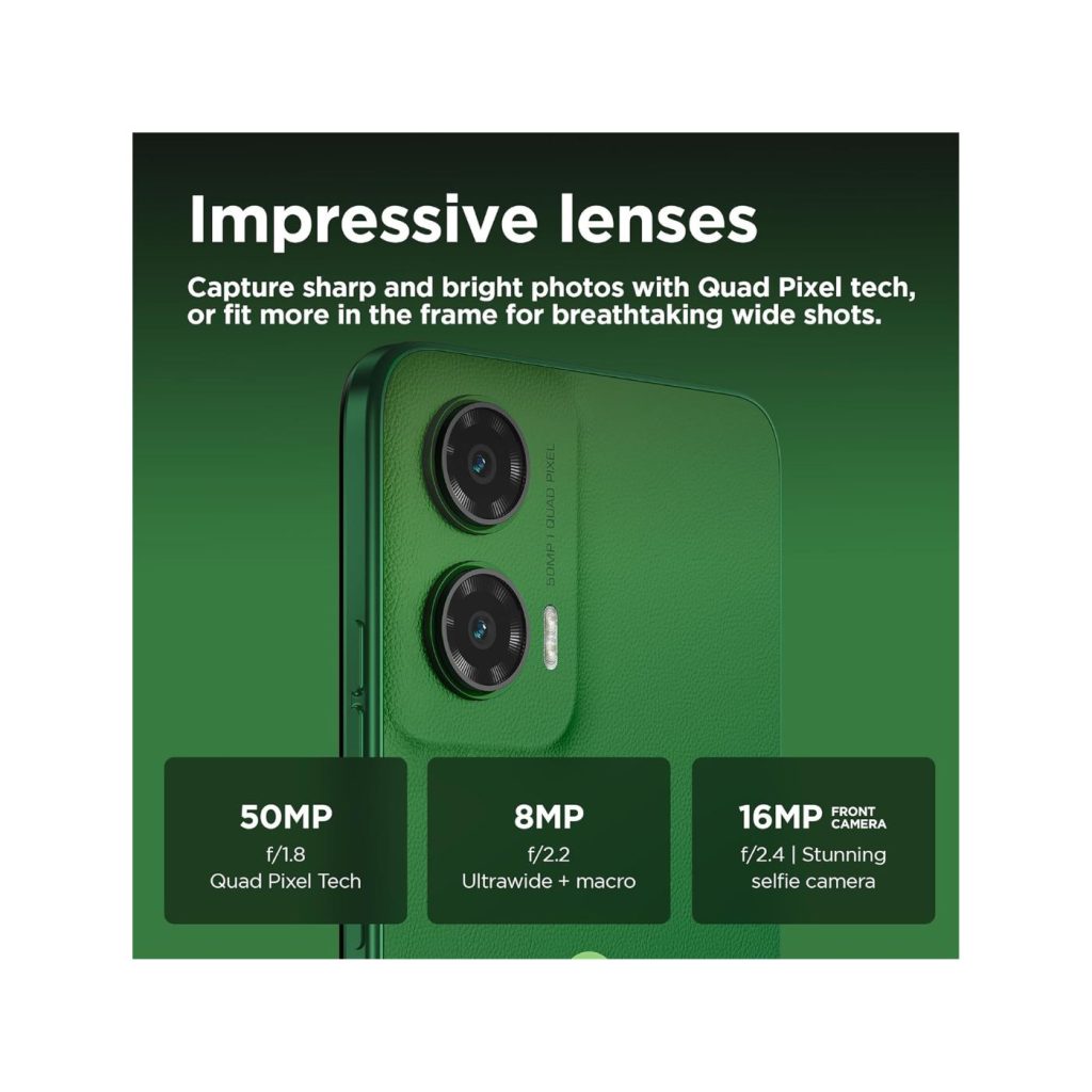This Motorola G35 stands out, not only in performance but in style too. The stunning Leaf Green finish adds a touch of elegance to your everyday tech. With its sleek, ergonomic design, the phone fits comfortably in hand, combining practicality with a premium visual appeal. It’s not just a device; it’s a statement piece that complements your lifestyle.