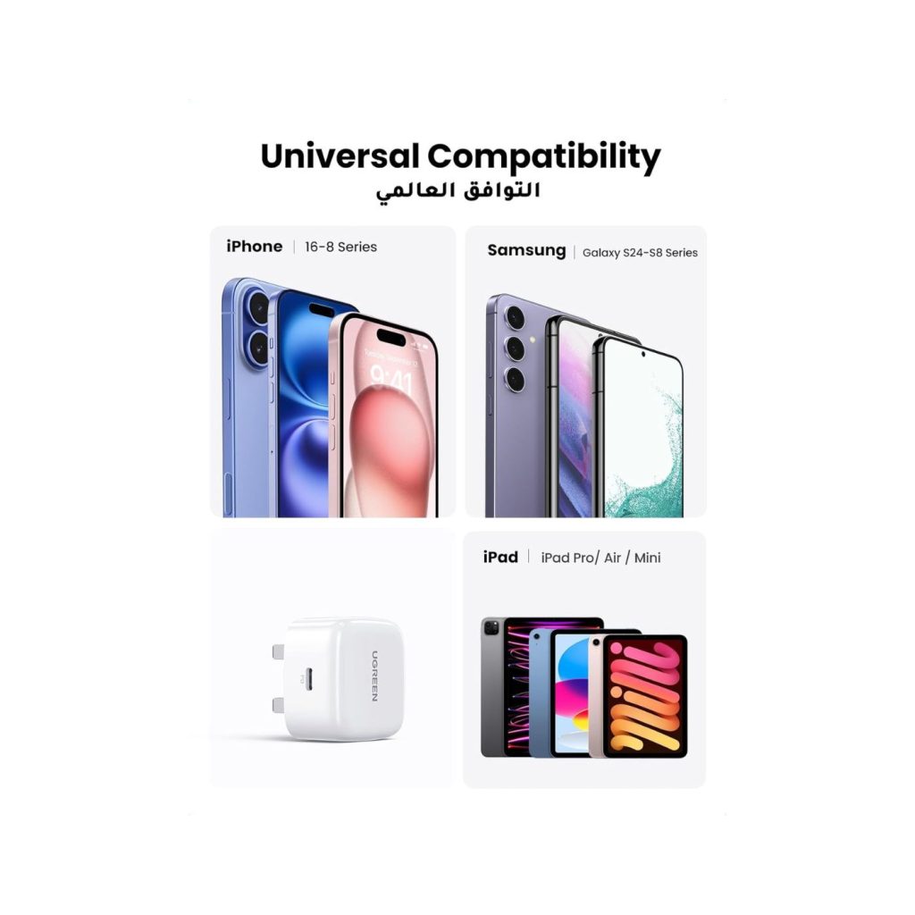 Safety is a top priority with the UGreen 20W USB-C PD Fast Charger. Its integrated safety features include advanced protection against overcharging, overheating, and short circuits, providing a secure and reliable charging experience. Moreover, this versatile charger is universally compatible with a wide range of devices, including iPhones, iPads, Android smartphones, tablets, and other USB-C powered gadgets, ensuring it meets all your charging needs.