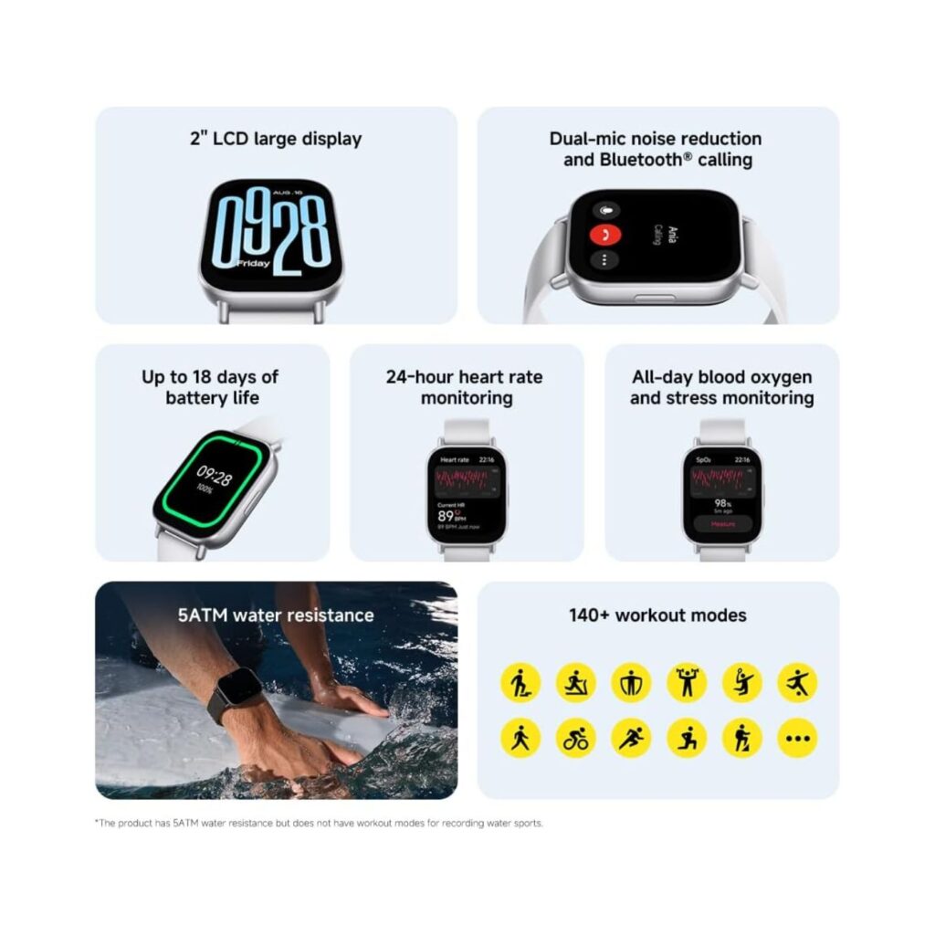 This smartwatch is more than just an accessory — it’s a partner in your wellness journey. Equipped with a heart-rate monitor, sleep tracker, and step counter, the Xiaomi Redmi Watch 5 Active provides real-time insights into your health metrics. Set fitness goals and track progress effortlessly with its advanced monitoring capabilities. Whether you’re running errands, at the gym, or enjoying a peaceful yoga session, this watch ensures that your health is always a top priority.